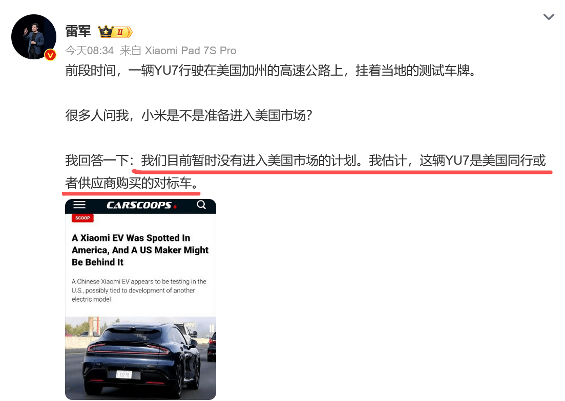 尽管小米汽车暂无进军美国市场的计划,但出海战略早已提上日程。按照卢伟冰的说法,小米汽车将先深耕国内市场,2027年再逐步拓展海外。这一策略符合市场规律,毕竟国内市场是小米汽车的基础,只有在国内站稳脚跟,才能更好地走向国际。