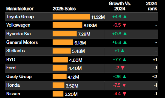 公司去年的全球汽车销量首次输给了比亚迪,后面这家中国公司在全球最大汽车制造商中的排名继续攀升。